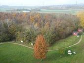 Schon von weitem ist das Wahrzeichen des Regionalparks Weilbacher Kiesgruben zu sehen: ein 41 Meter hoher moderner Aussichtsturm mit vier Zacken an der Spitze. Tatsächlich wirken die aufragenden Dreiecke aus der Ferne wie eine Krone, das V-Siegeszeichen oder gar wie Hasenohren – wenn man die darunter angebrachte Aussichtsplattform als Hasengesicht interpretiert. Oder auch wie eine Blüte, die sich behutsam öffnet. Es kommt halt auf den Standpunkt des Betrachters an.